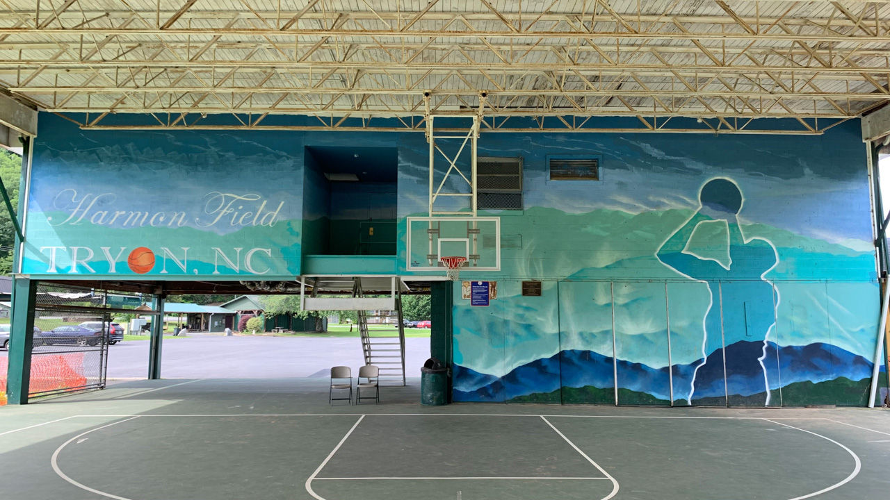 If you go back out to Harmon Field Rd. and take the next left past the tennis courts back into the park, you’ll see the large back wall of Harmon Field’s open-air gym. On the other side of that wall is a mural inspired by 17-year-old Mason Lassiter of Tryon who loved playing basketball there. In fact, Lassiter loved the gym so much that he took on an ambitious project raising money to rehabilitate the gym as his high school senior project. Lassiter raised $11,000 before his sudden passing. After his death the community rallied to raise the rest of the money needed for the $40,000 renovation. The project included this mural on the only inside wall of the gym depicting the Blue Ridge Mountains with the outline of a basketball player. Asheville artist Dustin Spagnola completed it in 2020.