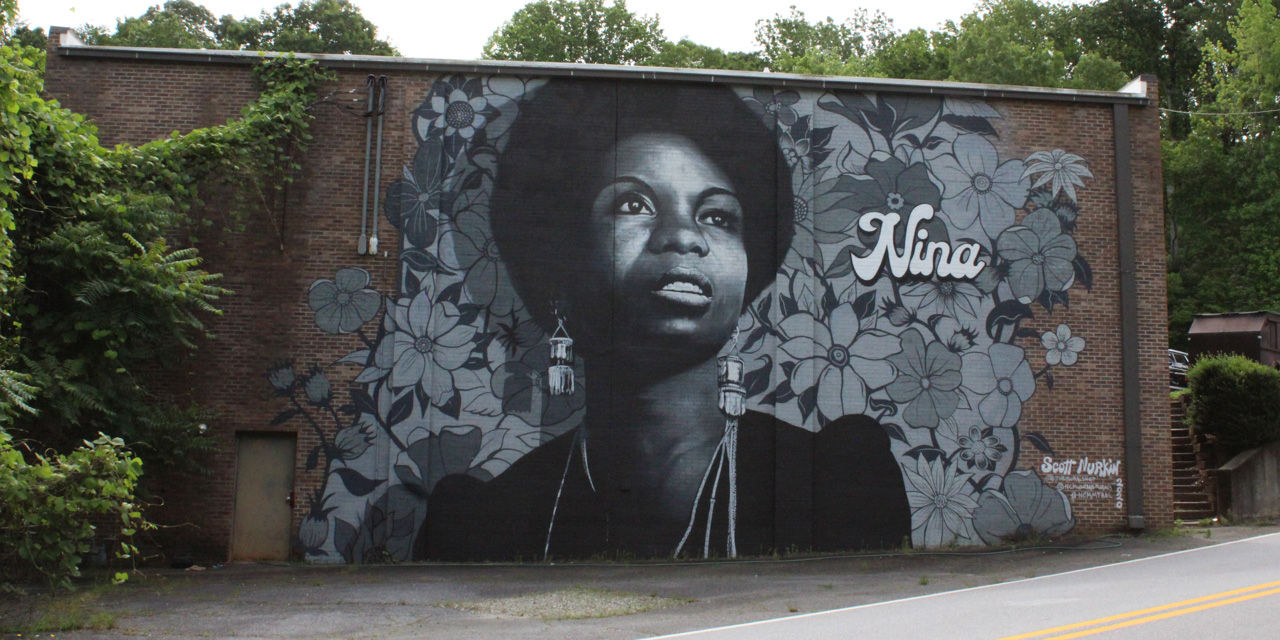 Traveling down, on 176 you’ll see the Tryon Food and Fuel convenience store on your right. On the back side of that building is a mural that’s another tribute to Tryon native Nina Simone. It was painted in 2020 by Chapel Hill artist Scott Nurkin and depicts Simone looking skyward with a floral backdrop. Nurkin founded the North Carolina Musician Murals Project that honors the great musicians of the state by painting murals of them in their hometowns. This mural of Simone is one of more than 20 murals Nurkin has painted since founding the project in 2019.